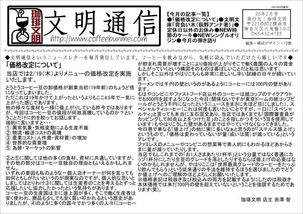 当店でもしこれまでの「お1人さまあたり1杯半」という分量ではなく普通にカップ1杯分にしたり生豆のグレードを落としたりするならば値上げの必要はないのかもしれませんが、やはりここは「世界最高グレードのコーヒーをたっぷり飲んでもらう」という従来通りの手法を維持するほうを選びましたのでどうか値上げへのご理解のほどよろしくお願いいたします。
